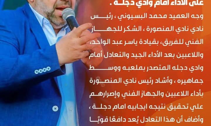وجه العميد محمد البسيوني ، رئيس نادي نادي المنصورة ، الشكر للجهاز الفني للفريق، بقيادة ياسر عبد الواحد، واللاعبين بعد الأداء الجيد والتعادل أمام وادي دجله المتصدر بملعبه ووسط جماهيره ،