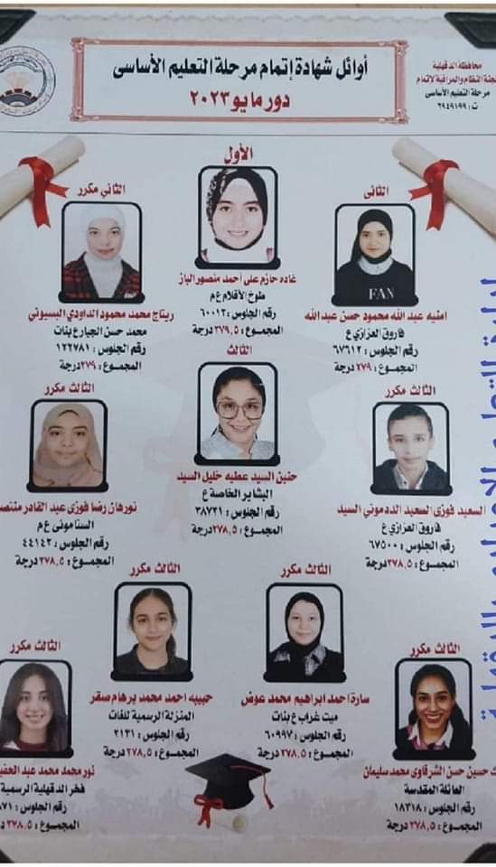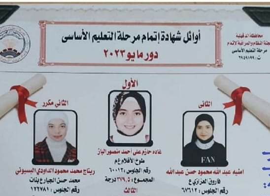 تزف قرية طوخ الأقلام بمركز السنبلاوين بالدقهليه أجمل التهاني والتبريكات إلى أسرة الطالبة غاده حازم علي احمد منصور الباز لحصولها علي المركز الاول علي مستوي محافظة الدقهلية في شهادة الاعداديه