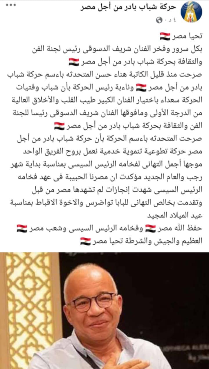 بكل سرور وفخر الفنان شريف الدسوقى رئيس لجنة الفن والثقافة بحركة شباب بادر من أجل مصر 🇪🇬