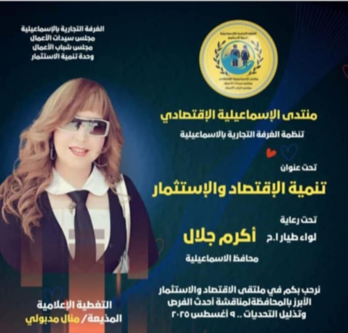 منال مدبولى(منتدى الإسماعيلية الاقتصادي تنظمة الغرفة التجارية بالاسماعيلية تحت عنوان تنمية الإقتصاد والاستثمار يومى ٨و٩ من الشهر الجاي