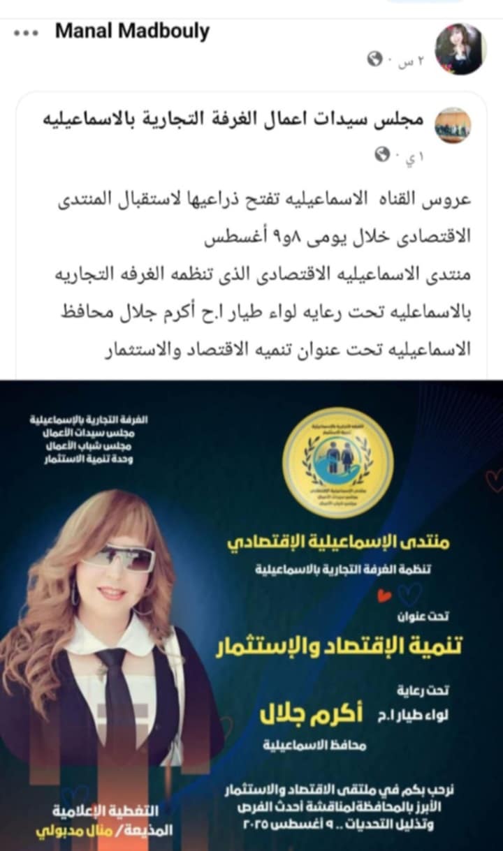 جدير بالذكر انها صرحت عبر حسابها فيس بوك بأن منتدى الإسماعيلية الإقتصادى الذى تنظمة الغرفة التجارية بالاسماعيلية تحت رعاية لواء!طيار اح أكرم جلال محافظ الإسماعيلية تحت عنوان تنمية الإقتصاد والاستثمار